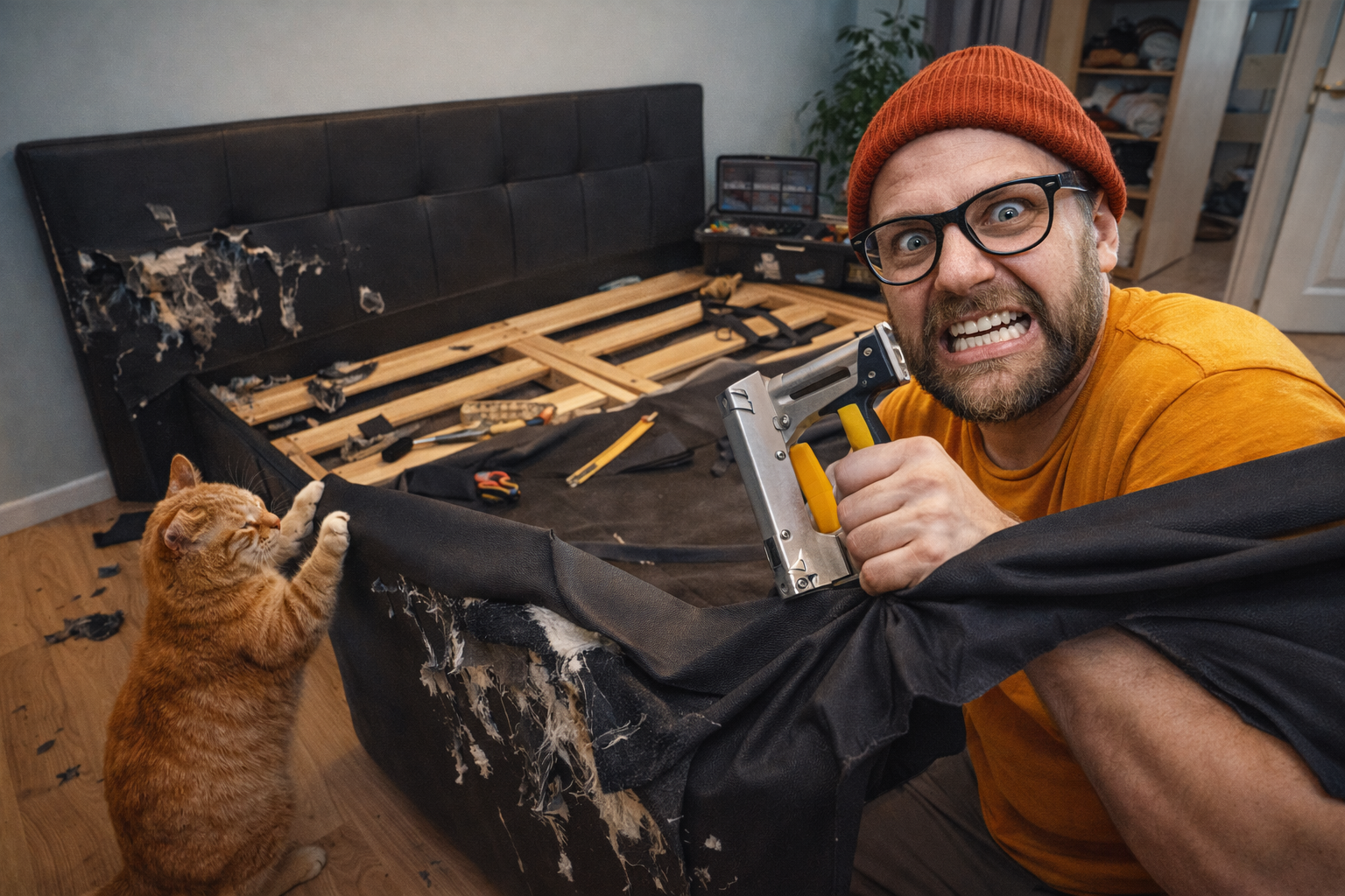 Мораль? Её нет. Есть только опыт, строительный степлер и обновлённый подголовник. А кошка… кошка уже смотрит на него с интересом. Но это, как говорится, проблема будущего.